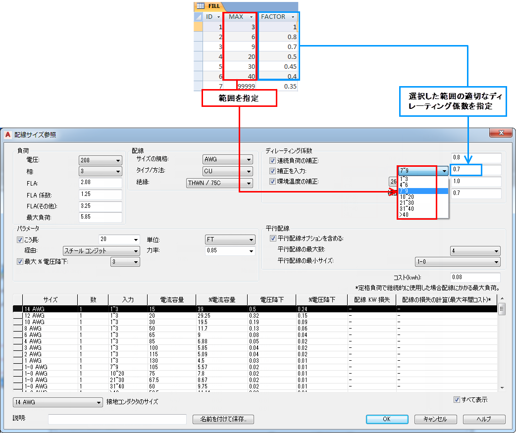 [配線サイズ参照]ダイアログ ボックスに表示される配線サイズの説明。たとえば、「12 AWG」、「250 KCMIL」などがあります。 |