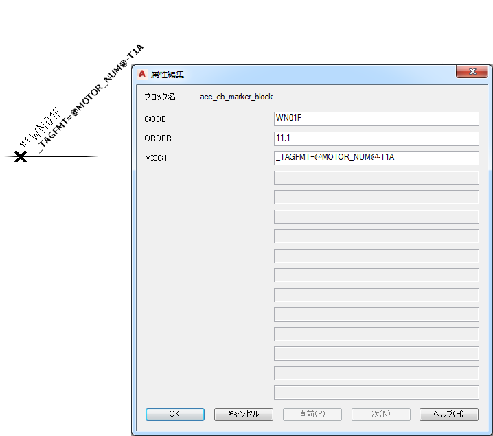 - モーター タグ値が必要な位置で、形式に @MOTOR_NUM@ を使用して、MISC1 属性値を編集します。たとえば、「_TAGFMT=@MOTOR_NUM@-%N」と入力するか、「_TAGFMT=@MOTOR_NUM@-T1A」のように、線番を事前定義します。