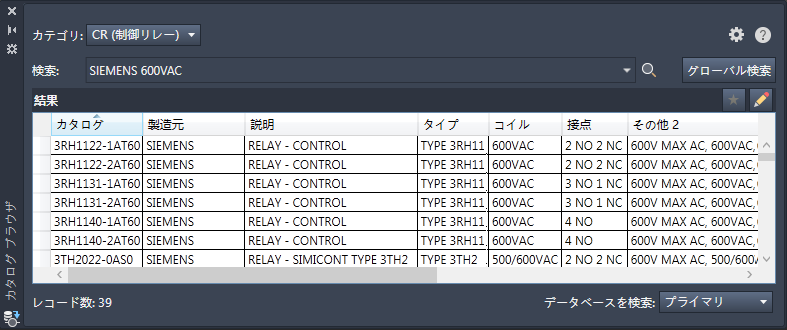 たとえば、カタログ値を指定せずにリレー コイルで[参照]をクリックすると、[カタログ ブラウザ]は、「600VAC」リレーの Siemens パーツ番号を検索します。カタログ データベース ファイルを編集して、_LISTBOX_DEF テーブルを選択します。これらのフィールド値を持つレコードを挿入します。