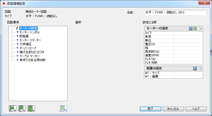 [モーターの設定]領域に値が入力されます。既定の配線サイズがモーターの負荷に基づいて選択され、[配線の設定]領域に表示されます。