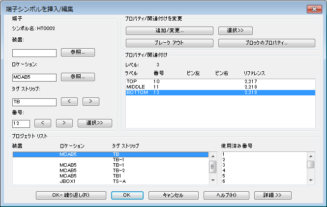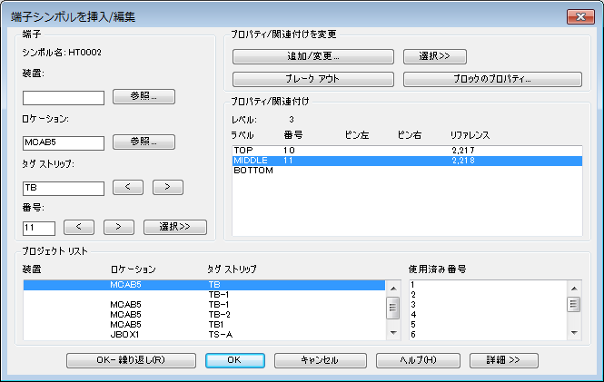 9. [端子シンボルを挿入/編集]ダイアログ ボックスの[プロジェクト リスト]領域で、タグ ストリップ TB を選択します。