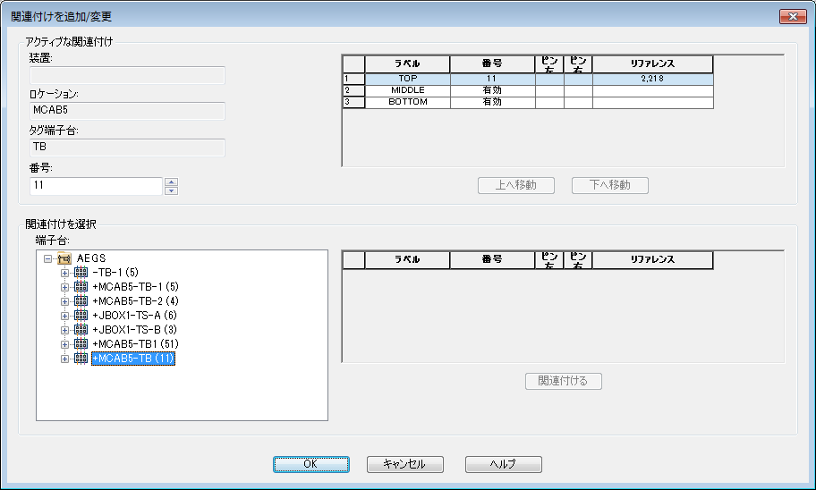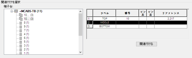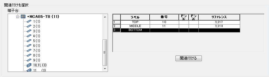 [関連付ける]をクリックすると、ダイアログ ボックスの[アクティブな関連付け]領域のグリッド内で中間レベルの端子番号が更新されます。