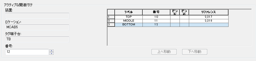 [関連付け]をクリックすると、ダイアログ ボックスの[アクティブな関連付け]領域のグリッド内で一番下のレベルの端子番号が更新されます。レベルを選択して[上へ移動]または[下へ移動]をクリックすると、レベルの順序を変更できます。