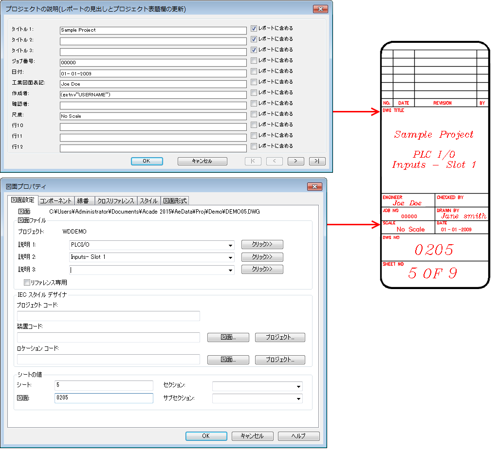 図面のプロジェクト表題欄が AutoCAD の属性付きブロックで構成されている場合、AutoCAD Electrical toolset では図面のプロジェクト表題欄を更新することができます。