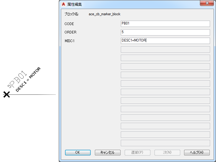 - AutoCAD Electrical toolset で、モーター シンボルの挿入点を定義するマーカー ブロックを見つけます。CODE 属性値を見つけます。たとえば、MTR03 などです。