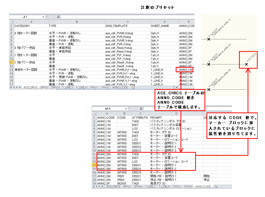 このシートは、選択した回路(ANNO_CODE 値によって識別)、特定のマーカー ブロック(CODE 値によって識別)、およびマーカー ブロックの特定の属性のリンクを提供します。