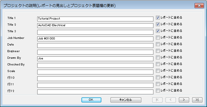 AutoCAD Electrical toolset のプロジェクト表題欄とプロジェクトの説明のダイアログ ボックスには、「LINE1」、「LINE2」のような汎用のラベルが表示されます。プロジェクト表題欄へのリンクに一致するように、これらのラベルを変更することができます。たとえば、AutoCAD Electrical toolset データの「LINE4」値をプロジェクト表題欄の「JOB#」属性にリンクしているとします。AutoCAD Electrical toolset のプロジェクト表題欄に関連するダイアログ ボックスのラベルとして、「LINE4」ではなく「ジョブ番号」(「JOB#」属性)を表示できます。WDL の拡張子を持つテキスト ファイルにカスタム ラベルを定義します。