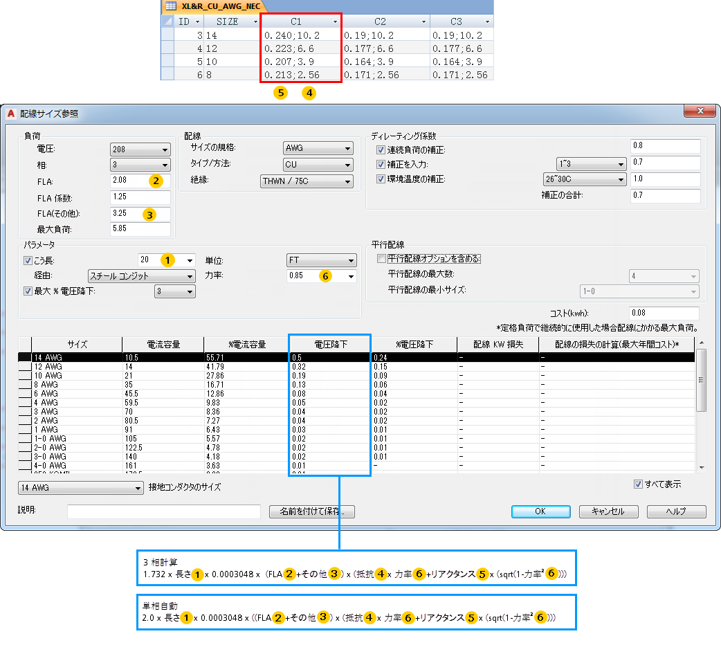[こう長]がオンの場合は、力率値は電圧降下の計算に使用されます。 |