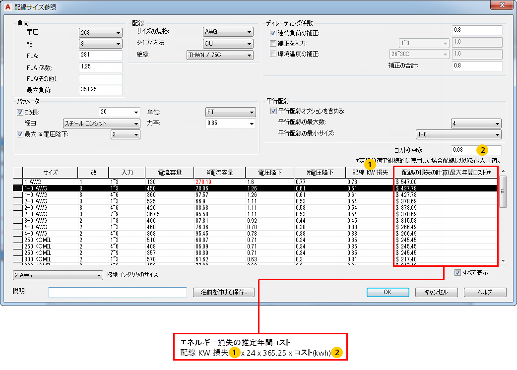 定格の負荷で使用を続けた場合の配線の損失の最大コストです。 |