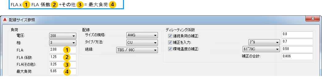 コンダクタの計算上の最大負荷を表示します。これは、製品の FLA×FLA 係数の値に、FLA(その他)を加算した値に基づいています。 |