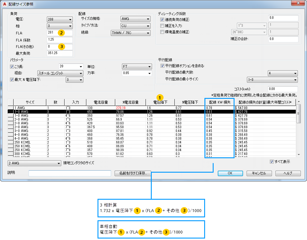 配線のパラメータを指定し、配線サイズのリストからパラメータに一致する配線サイズまたはパラメータを超える配線サイズを選択します。推定される配線サイズごとのエネルギー損失は、この選択に有益な情報を提供できます。