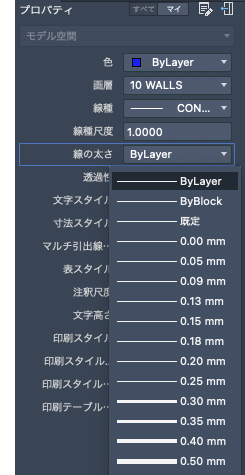 線の太さは[ByLayer]のままにすることも、画層の線の太さよりも優先される値を指定することもできます。一部のケースで線の太さのプレビューがすべて同じに見える理由は、モニタでは線の太さが近似化されたピクセル幅で表示されるためです。