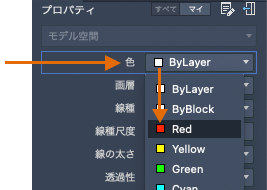 [プロパティ インスペクタ]パレットには、重要なプロパティの設定がすべてリストされます。使用可能なフィールドをクリックすれば、その現在の設定を変更できます。次の例では、オブジェクトが選択されていない場合、現在の色は[ByLayer]から[Red]に変更されます。これ以降に作成するオブジェクトには、[Red]の色プロパティが割り当てられます。