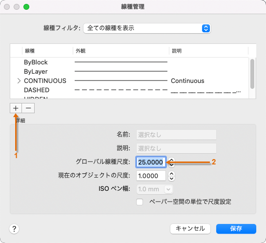 [形式]メニューから、[線種]をクリックします。これにより、[線種管理]ダイアログ ボックスが表示されます。