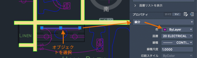 パレットには、選択したオブジェクトの現在のプロパティが表示されます。これらのプロパティは、項目をクリックし、設定を変更することで修正できます。"ByLayer" に設定されているプロパティは、画層の設定を継承しています。上記の例では、画層 20 ELECTRICAL 上に作成されたオブジェクトは紫色です。これは、この色がこの画層上のオブジェクトの既定の色であるためです。