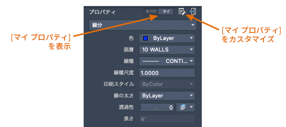 [プロパティ インスペクタ]を切り替えて、選択したオブジェクトのすべてのプロパティを表示したり、個人用にカスタマイズしたプロパティ リストを表示することができます。個人用にカスタマイズしたプロパティ リストをセット アップするには、[マイ プロパティをカスタマイズ]ボタンを使用します。