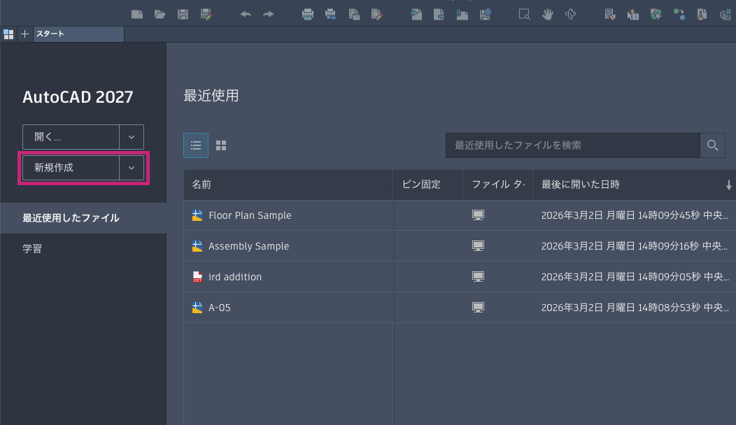 AutoCAD を起動した後、[スタート]タブで[新規作成]をクリックするか、[新規作成]ドロップダウン メニューをクリックして新規図面を開始します。