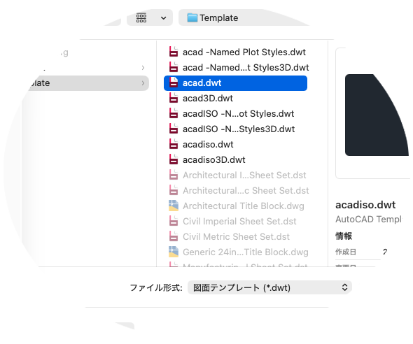 任意の図面(.dwg)ファイルを、図面テンプレート(.dwt)ファイルとして保存できます。既存のテンプレート ファイルに基づいて図面テンプレート ファイルを作成するには、既存の図面テンプレート ファイルを開いて修正し、別のファイル名で保存します。