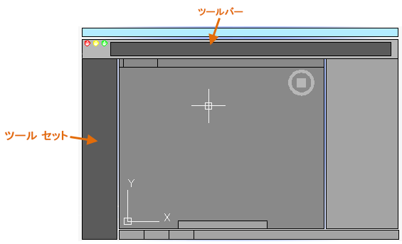 AutoCAD には、作図領域の左側にツールセットが含まれています。[製図]タブから、このガイドで紹介するコマンドのほとんどにアクセスできます。また、作図領域の上のツールバーには、[新規作成]、[開く]、[保存]、[印刷]、[元に戻す]など、頻繁に使用するコマンドが含まれています。