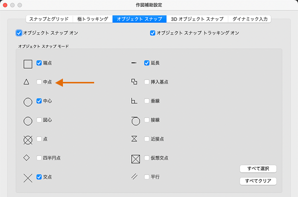 「定常オブジェクト スナップ」と呼ばれる既定のオブジェクト スナップを設定するには、OSNAP[オブジェクト スナップ設定]コマンドを使用します。たとえば、[中点]オブジェクト スナップを既定でオンにしておくと便利な場合があります。