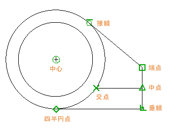 オブジェクト上の正確な位置を指定する最も重要な方法は、オブジェクト スナップです。次の図では、各種のオブジェクト スナップがマーカーで示されています。