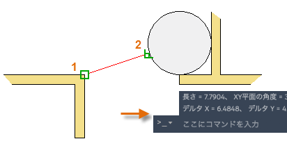 ダイナミック入力 | カーソルの近くに距離と角度が表示されます。[Tab]を使用してフィールド間を移動し、入力することができます。 |