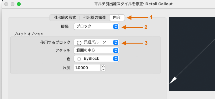 をクリックし、新しいマルチ引出線スタイルのわかりやすい名前を指定します。次に示すように、[内容] (1) をクリックし、[ブロック] (2) を選択し、[詳細バルーン] (3) を選択します。