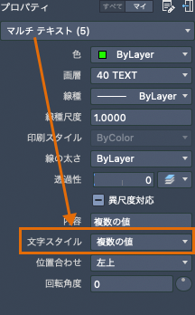 他のいくつかの注釈機能と同じように、マルチ テキストにも多数の設定が用意されています。このような設定は、STYLE[文字スタイル管理]コマンドを使用して「文字スタイル」 として保存できます。その後、[プロパティ インスペクタ]パレットの[文字スタイル]ドロップダウン矢印をクリックして保存した文字スタイルにアクセスすることができます。オブジェクトが選択されていない場合、[プロパティ インスペクタ]パレットには現在の文字スタイルが表示されます。