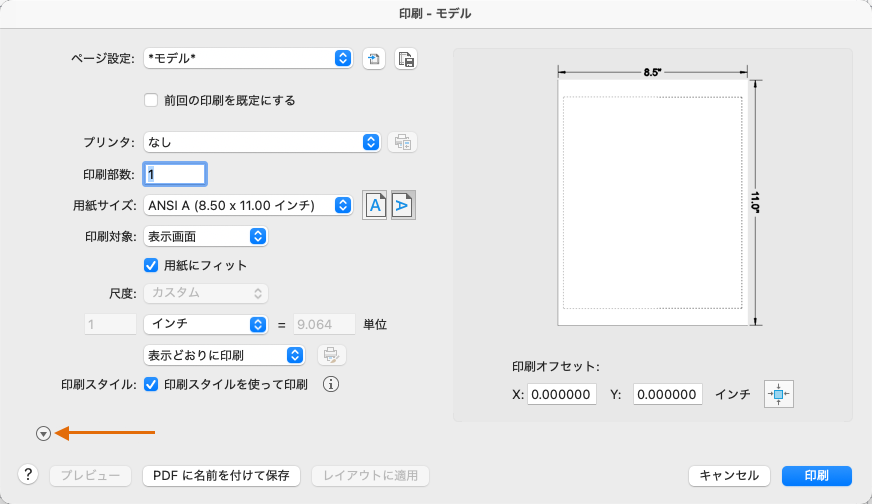 [印刷]ダイアログ ボックスの一部のオプションを非表示にするか、すべてのオプションを表示するかをコントロールするには、示されている矢印をクリックして展開します。