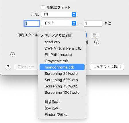 印刷スタイル テーブルは、色の処理に関する情報を提供します。モニタでは適切に表示されている色が、PDF ファイルや印刷に適しているとは限りません。たとえば、図面はカラーで作成しても、モノクロで出力したい場合もあります。ここで、モノクロ出力を指定する方法を説明します。