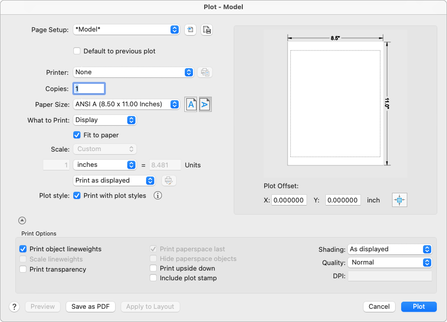 印刷の設定作業が簡単になるように、このような設定の集まりを保存し、名前で呼び出すことができます。これを「ページ設定」と呼んでいます。 ページ設定を使用することで、異なるプリンタでの印刷、グレースケールでの印刷、図面からの PDF ファイルの作成などに必要な設定を格納することができます。