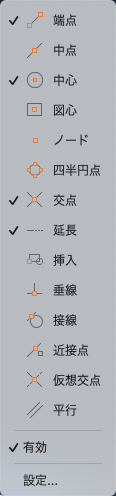 ステータス バーで[オブジェクト スナップ]を右クリックして、[設定]を選択します。