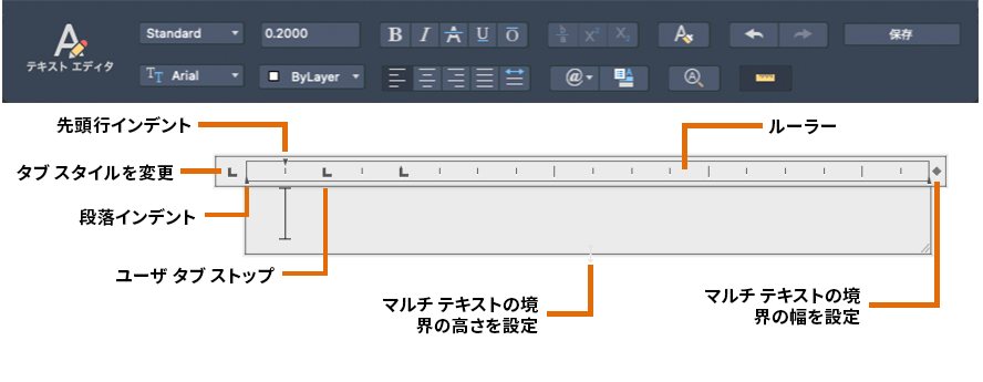 マルチ テキストで使用する文字を他のファイルから読み込むまたは貼り付けたり、タブを設定したり、段落や行の間隔と位置合わせを調節したり、段組みを作成、修正できます。