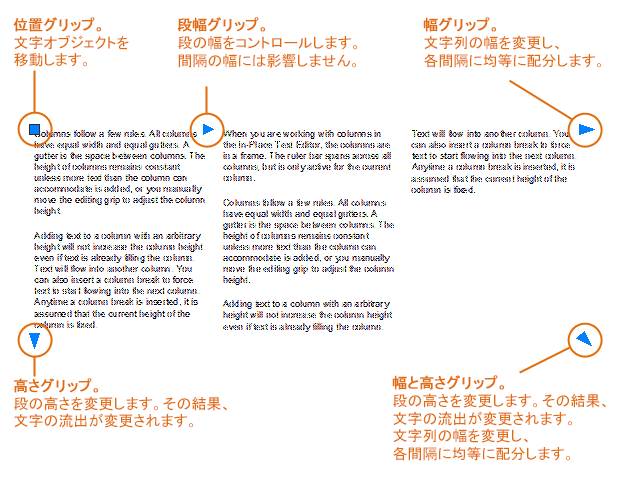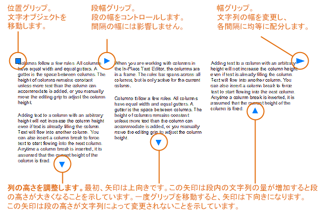 次の図は、[ダイナミック段組み]を[高さ手動設定]に設定しているときのグリップの使用方法を示しています。