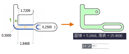 総面積から指定した面積を差し引きます。総面積と周長が、コマンド プロンプト領域およびツールチップに表示されます。