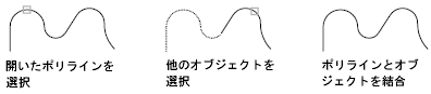 開いているポリラインの端点に線分、円弧、またはポリラインを追加します。フィットカーブ ポリラインからはフィットカーブが解除されます。PEDIT コマンドの最初のプロンプトに対して[一括(M)]オプションを選択していない場合は、ポリラインに結合するオブジェクトの端点がポリラインのどちらかの端点と接触していなければなりません。このとき、端点が許容距離以内にあれば、正確に接触していないポリラインであっても結合できます。