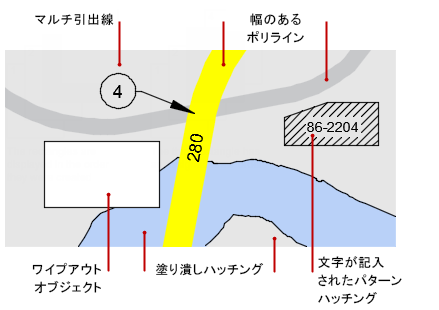 一般的には、注釈オブジェクトは他のオブジェクトより前に、ハッチングと塗り潰しは背後に表示および印刷します。ワイプアウト オブジェクトは、下にあるオブジェクトを修正することなく文字を追加するための空白領域を提供するオブジェクトです。