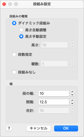 種類、段数、高さ、幅、間隔サイズのような段組みを設定するためのオプションが表示されます。