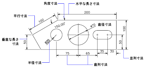 長さ寸法には、水平寸法、垂直寸法、回転寸法、並列寸法、直列寸法があります。次の図に簡単な例を示します。