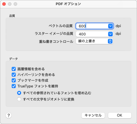 - PDF ファイルに TrueType フォントを埋め込み、PDF ビューアで使用可能にする必要をなくします。このオプションをオンにしないと、PDF ビューアでは代替フォントが使用されます。