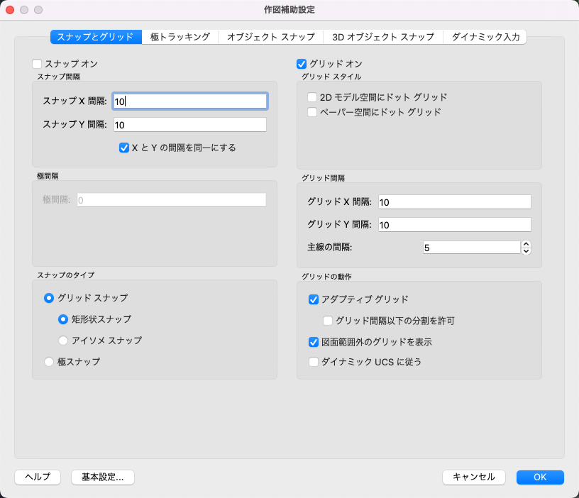 X 方向のグリッド間隔を指定します。この値を 0(ゼロ)にすると、グリッド間隔は[スナップ X 間隔]の値とみなされます。(システム変数 GRIDUNIT)