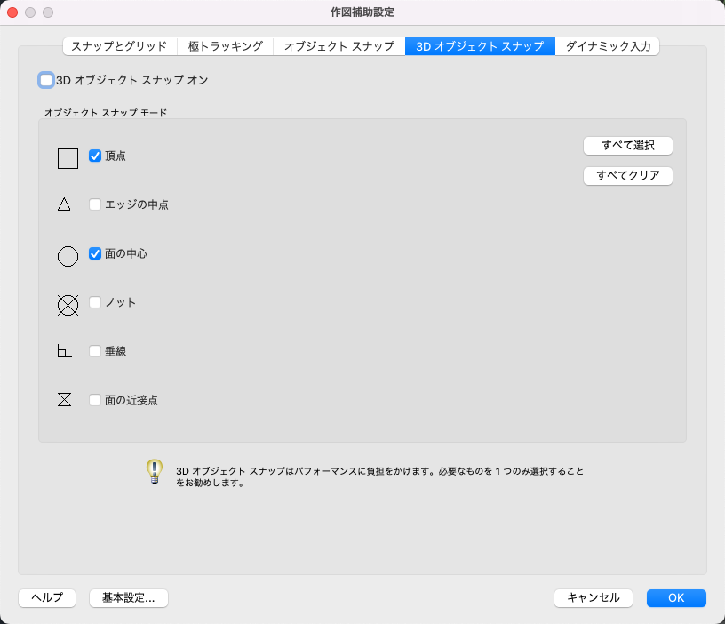 3D オブジェクトの定常オブジェクトスナップをコントロールします。定常オブジェクト スナップ(オブジェクト スナップは「O スナップ」ともいいます)を設定すると、オブジェクト上の正確な位置にスナップ点を指定できます。複数のオプションを選択すると、選択したオブジェクト スナップ モードのうち、ターゲット ボックスの中心に最も近い点を検出するオブジェクト スナップ モードが適用されます。[Tab]を押すと、オプションが順番に切り替わります。