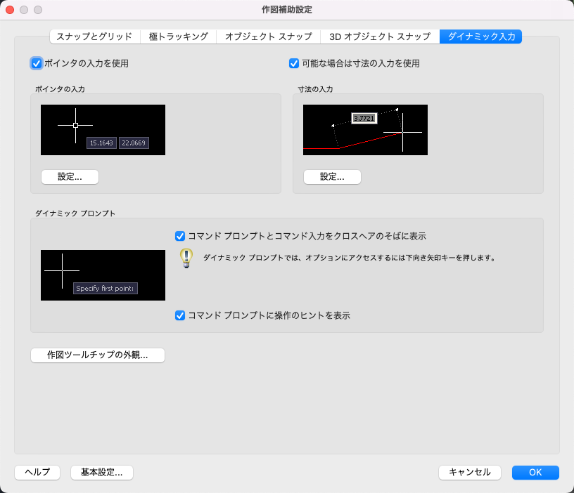 ポインタ入力、寸法入力、ダイナミック プロンプト、および作図ツールチップの外観をコントロールします。