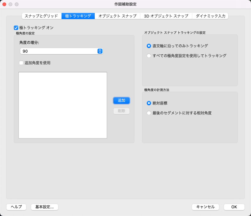 [追加角度を使用]をオンにすると、使用可能な追加角度が一覧表示されます。新しい角度を追加するには、[追加]をクリックします。既存の角度を削除するには、[削除]をクリックします。(システム変数 POLARADDANG)