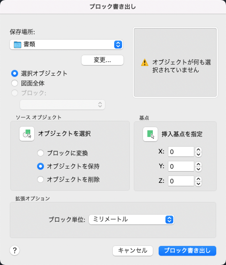 現在の図面で選択されたオブジェクト(1 つまたは複数)を、ファイルとして保存した後で現在の図面のブロックに変換します。