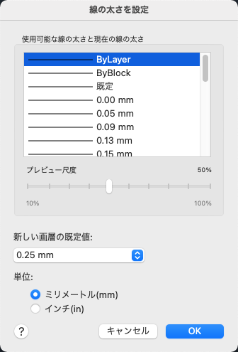 Controls the DEFAULT lineweight for layers. The initial DEFAULT lineweight is 0.01 inches or 0.25 mm. (LWDEFAULT system variable)