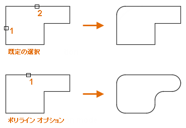 フィレットまたは丸めは、1 つのコマンドを使用して 2D ポリラインの 1 つの頂点またはすべての頂点に挿入することができます。ポリラインの各頂点にフィレットまたは丸めを追加するには、[ポリライン(P)]オプションを使用します。