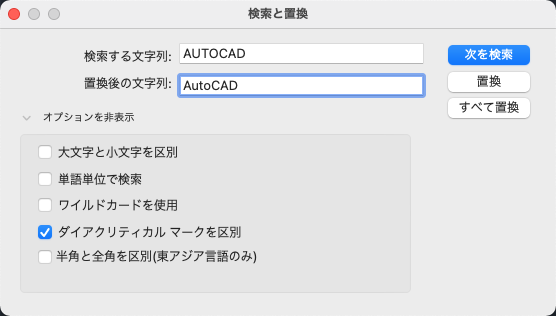 文字列内のすべての文字の大文字/小文字が、[検索する文字列]と一致する必要があります。このチェック ボックスをオフにすると、文字の大文字と小文字には関係なく、指定した文字列とマッチするものが検索されます。