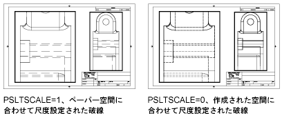 - システム変数 PSLTSCALE を設定して、レイアウト(ペーパー空間)とレイアウト ビューポート(モデル空間)に異なるズーム倍率で表示されているオブジェクトに対して、同じ線種尺度を一貫して適用することができます。例: