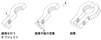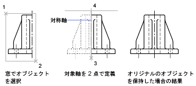 対称軸と呼ばれる軸を中心にオブジェクトを反転して、鏡像イメージを作成します。この一時的な対称軸を指定するには、2 つの点を入力します。元のオブジェクトは、削除することも、そのまま残しておくこともできます。